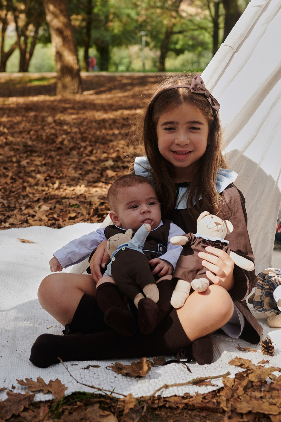 Este fofo castanho com detalhes azuis é o sonho desta estação. Elegante e intemporal, esta é uma das opções perfeitas para os looks de festa. Totalmente forrado no interior com tecido 100% algodão e com molas no interior das pernas para ser ainda mais práticos.