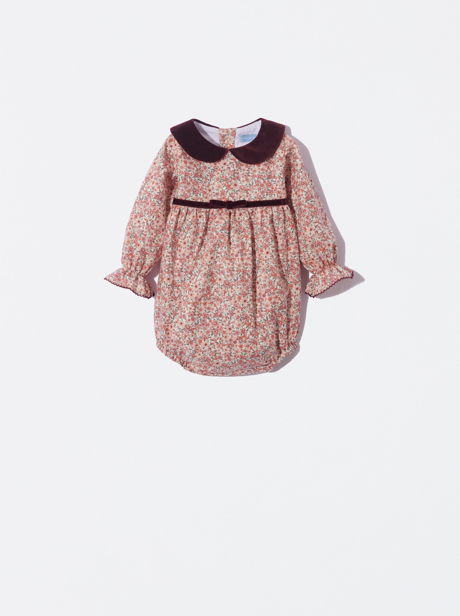 Este fofo em padrão floral 100% algodão com gola de veludo conjuga a delicadeza e conforto. Com detalhe de laço e gola em veludo, este fofo é uma ótima opção para a noite de natal! Totalmente forrado no interior com tecido 100% algodão e com molas no interior das pernas para ser ainda mais práticos.