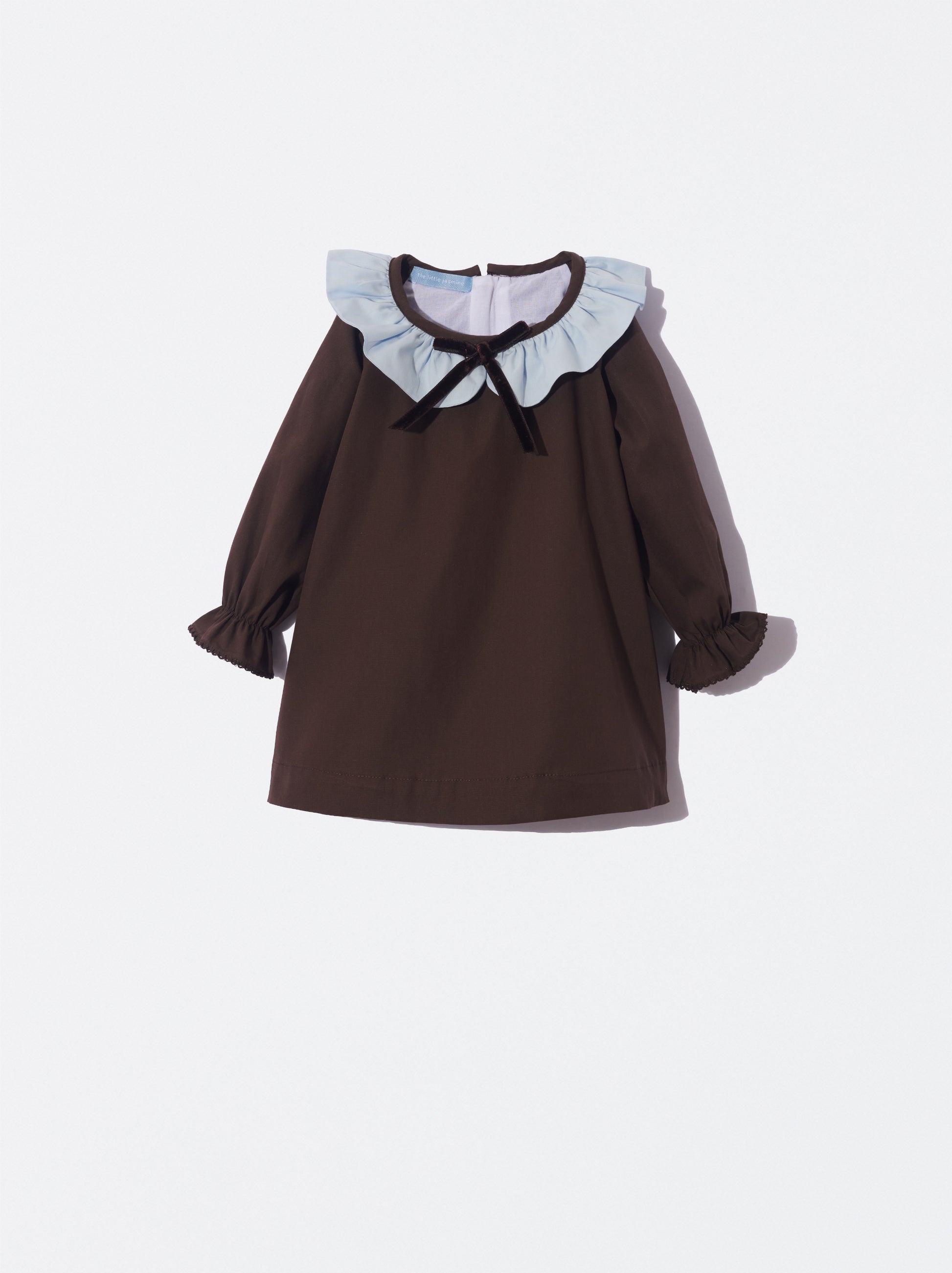 Este vestido castanho com gola azul e laço em veludo é o sonho desta estação. Elegante e intemporal, esta é uma das opções perfeitas para os looks de festa. O vestido é totalmente forrado com tecido 100% algodão e fecha atrás com um fecho invisível.
